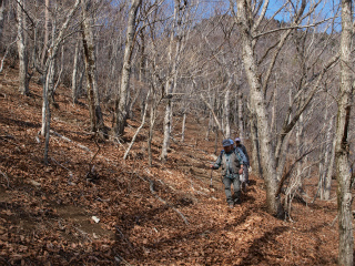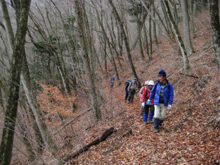 | お坊山(笹子) 急速に天気が回復するだろうとの予報に予定どおり実施することにした木曜山行だった。今回は、ほかの企画山行ではご一緒したこがあるものの、木曜山行としては初めてペンション風路ご夫妻が参加、ならば頂上に着く昼ごろにはスカッと晴れ渡ってほしいものだったが・・・。 昨日は大鹿峠へまず登り、お坊山を経て南東尾根を下って棚洞の下から出発点に戻って周遊することにした。そこに下りつく予定にしている、棚洞東の稜線へと続く径の入口にはかつて「大鹿峠」と書かれた大月市の道標が置かれていたが、これはまったく意味不明で、次に登ったときにはそれをマジックで消して「お坊山」と誰かによって書かれていた。これで理屈は合う。しかし今回は道標そのものがなくなっていたのである。 大鹿峠へは荒れた沢沿いを登った記憶があったが、今では、地形図にある鉄塔巡視路とおぼしき径が再整備されたとみえ、延伸中の林道の途中に立派な導入路ができていた。これを歩くのは初めてだったが、実に雰囲気のいい径で、登るともなく登って大鹿峠へたどり着いた。 北斜面を登る、ここからお坊山の間だけはアイゼンがいるかもしれないなと考えていたが、案の定半分くらい登ったところから落ち葉の下が凍っていることが多くなった。念のためアイゼンをはいて登っていく。しかし稜線まではいくらでもなかった。 アイゼンをはいた頃からあたりに霧氷が現れたのが、稜線に出てからお坊山西峰への間で圧巻となった。予報とは裏腹にいっこうに日が射しそうにもないが、そのおかげで霧氷が楽しめたわけである。 お坊山東峰で昼休みとした。晴れるどころか霧は濃くなるばかり、暖かければ1時間くらいはのんびりしたいところだが、早々に出発することにした。ここから棚洞へは、かつて林内作業車を通した幅広い道が残っていて、少々迂回はするものの、のんびりと下るには絶好だったが、さすがにそれも長く堆積した落ち葉によってか細くわかりづらくなっている。それにしてもこのあたりの林の雰囲気の良さは特筆に価する。 棚洞の下で出発点に戻る径があるはずで、それを見落とすはずはないとあらかじめ以前の記録を確かめてこなかったのが失敗で、ここだと思った踏跡をすこし探ったが、今ひとつ自信がないまま、もう少し下ってみようと下り、やはりさっきのがそうだったと思ったときにはもう登り返す気もなくなって、そのまま桜公園へと下ってしまうことにした。入口の道標が撤去されれば、それを登ってくる人はまずないわけで、径形も薄れていたのだろう。 そのかわり桜公園への径は、かつては最後の最後で踏跡が不明になって強引に下ったものだが、これはかなりはっきりしてきていた。もっとも急転直下であることに変わりはない。何が午後から晴れるものか、いつのまにか雪が舞っていた。最後まで天気は回復しなかったが、霧氷といい雪といい寒さといい、おそらく最後の冬を楽しんだお坊山だった。 |