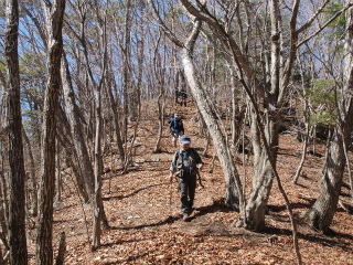 | 鳥坂峠〜黒打ノ頭 (河口湖西部) 2月最終週に計画していた黒打ノ頭は、地元では滅多にない多雪だったことでスノーシュー遊びに変更した。鳥坂峠からの縦走がわりと長いので雪があったら厄介なことと、自転車で車の回収をするつもりだったので、車道が凍結でもしていたらこれも厄介なことがその理由でもあった。 今週は大室山の予定だったが、諸事勘案して黒打ノ頭に変更した。冬はとにかく積雪の具合でまったく予定が変わってしまう。この冬はこれで4回目の予定変更であった。 暖かい日が続いていたが、久しぶりに冷え込んだ朝だった。おかげでとにかく山々は真冬のようにくっきりと見える。しかし白峰三山がべったりと白いのはやはり春らしい。 甲府盆地では桜がちらほら咲いており、スモモにはすでに満開の木もあったが、さすがに鳥坂峠まで登るとキブシやダンコウバイがやっと咲いているばかりだった。 スカッと開けた展望こそないが、とにかく樹林の美しい稜線である。県内屈指といってもよかろうと思う。新緑の頃の美しさが想像された。しかしなかなかの長丁場の上にひんぱんに登降を繰り返す。 一応名前のあるピークということで目的の山を黒打ノ頭とした。その頂上にある三角点名の「神座山」をそのまま山名標示とした地元自治体の看板によって山名が混迷してしまった山だが、当然こんな特徴に欠けるピークが神座山であるはずはない。 その黒打ノ頭で少しおそい昼休みとなった。私の誕生日の前祝いとかでTさんがケーキを造ってきてくださったり、山歩大介さんがドリップコーヒーをたててくださったりした。あらためて御礼申し上げます。 当初は余裕があれば釈迦ヶ岳へもという声をあったが、黒打ノ頭から本日の最高点の登りを終え、次の鞍部にある芦川への分岐まで来ると、予想通り、次の機会にしましょうとなった。縦走はとにかく疲れます。 |