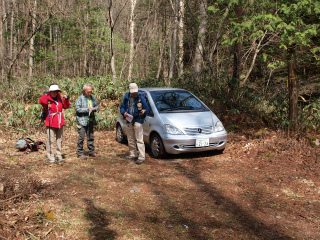 | 雨引山(大町南部) おとみ山が長年乗った車をそろそろ買い替えようかというので、前回の木曜山行のとき、たまたた私が知っていた中古車の情報を話した。 それが昨日までの1週間であれよあれよと商談成立、名義変更も済まぬというのに車が先に手元に到着してしまったのだからそのスピードには驚くばかり、ならばよし、ちょうど絶好のドライブ日和にもなったことだし人数も乗用車にぴったりの4人である。春の安曇野へとあたらしい車を駆って繰り出すことにしたのであった。 その車というのが世界の名車、スリーポインテッドスター、メルセデス・ベンツである。私が運転していったが、こういう車に乗ると、自分の10人乗りワゴンが嫌になる。高速道路をそこのけそこのけと走ったと言いたいところだが、同じベンツでもその手の下品なベンツではありません。 それはさておき、3回目の雨引山だったが、天気はこれまでで最高であった。お目当てのイワウチワも咲いていた。もっともこれは群落の規模が小さくなっているように感じられた。 前回はイワウチワもさることながら、山を銀色に染めたタムシバの花が見事だった。しかしそれが見られたのはおそらく数年に一度の幸運だったのだと思う。今回はまったくといっていいほど花は見られず、咲いていたと思われる木も、ここのところの低温で黒く変色した花を根本に落としていた。 頂上には誰もいなかった。西側の落葉松が邪魔だが、まずまず展望の山頂といってよかろうと思う。雨飾山から妙高山にかけての山々がずらりと並んでいるのが見られたのはうれしかった。1時間あまりを山の同定をしながら過ごした。 帰りは途中から違う径を歩いて戻るのが常で、今回もそうしたのだが、下山路としてあった径が伐採のせいかわかりづらくなっており、藪をこぐ始末になった。まあ、それもごくわずかな時間で林道に出ればあとはそれをぶらぶらと降るのみで、午後早いうちに出発点に戻った。 |