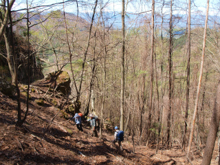 | 浜立尾根から滝子山 (笹子) 滝子山には何度も登ったが、季節は秋から冬にかけてのみ、ルートは南稜を登ってずみ沢を下るというワンパターンだった。樹林に魅力がある山だというのに新緑に歩いたことがないのは不思議なくらいで、Tさんから滝子山のリクエストがあったとき、これはぜひ新緑の時季にして、ルートも少し工夫を加えたいと思った。 そこで浜立尾根を登ることにした。道証地蔵まで車が入る現在、標高差的にはもっとも簡単に滝子山を周遊できるコースとなる。以前からずみ沢を下ってきたとき、これが浜立尾根の入口だなと横目に見ながら通過してきたが、やっとそれを登ることになったのである。 インターネットで少し下調べしたが、浜立尾根は下った記録ばかりが多いのは不可解で、こういった尾根は登るのが易しく、下りはずみ沢経由のように迂回ではあっても傾斜がゆるいほうが易しい。 地形図どおりの急な尾根だったがその分勝負は早い。道標はひとつもないものの、径といってもいいような踏跡が続いていた。南稜と同様にミズナラ主体の広葉樹の新緑は中腹で圧巻となった。浜立山直下では岩尾根となるが、南稜ほどの険しさはない。 浜立山の手前で頂稜に出ると北側は植林の落葉松となるので自然林の良さは少々失われる。頂上では先着のふたりが休んでいた。まだ昼には早い時間だったし、午後にわか雨という予報を考慮して、短い滞在で下ることにし、広々した防火帯まで下ってから昼食とした。大谷ヶ丸がすばらしく立派に見える。 防火帯が終るころからずみ沢沿いの径にかけて新緑がふたたび圧巻となり歓声しきりであった。登山口に無事帰り着いたのはまだ2時半、3時頃には雨が降り出したので、実に幸運であった。 |