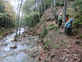 千曲川をさかのぼるにつれ木々の黄葉も見ごろになった。源流手前では遊歩道といってもよかったおだやかな道は荒れていて、あとで小屋で聞けば9月の台風の大水のせいだったらしい。落ち着いた感じになるには数年かかるだろう。水源地標も少し傾いていたが、水に洗われたせいかもしれない。