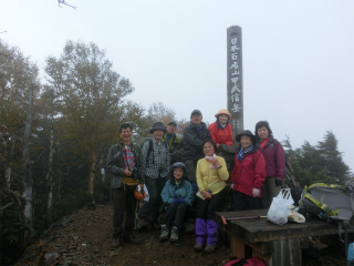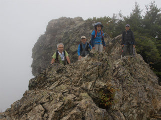 ようやくたどり着いた頂上からは展望皆無で、お隣の岩峰がときたま姿を現すのみ。この高さにいるにしては気温も高く風もないので昼食をとりながらしばらく滞在したが、ついに霧は晴れなかった。秋の好日の予報に他の登山者もいるかと思ったのだが、結局この日御座山に登ったのは我々だけだったらしい、誰も登ってこなかった。