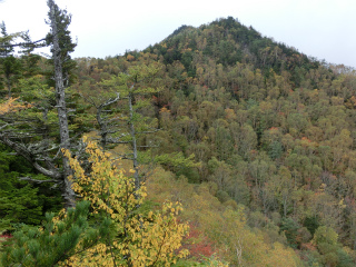 車で登れる山を歩いて登る人は少ないからだろう、登山道の地面はあくまで柔らかい。途中、「丸尾のブナ」というブナは根元から何本も枝分かれした、樹齢600年といわれる大木だが、その1本が先日の台風のせいか無残に折れていた。他の幹も根元のウロは大きいようで、そろそろ木の末期を迎えているのかもしれない。