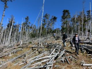 駐車場から適当に登って尾根筋に出ると、わずかばかりだが踏跡がある。ところどころで雪の白根三山がぐっと近く見える。その展望もさることながら森の雰囲気がなんともいえない。