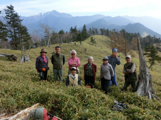 いくつかの小さなピークを越すと、文字通り笹に覆われた笹山に着く。頂上からわずかに南に寄ると、塩見岳から聖岳にかけて、南アルプスの南半分が重畳と連なって遠ざかるのが眺められる。