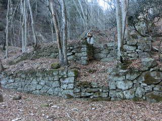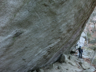 | 御嶽参道・旧羅漢寺を訪ねる(甲府北部) 以前、御嶽参道のことを調べていたときに、吉野さんという人の、旧羅漢寺跡を訪ねたブログが目に留まった。http://blog.goo.ne.jp/yamanashi100yama/e/327b6a98612faddb00020650526e9464探せば他にも旧羅漢寺に関する記事はあって、その在った場所から、現在の羅漢寺山という名称が素直に納得できるのである。 だいたいがにぎやかなところが趣味ではないから、羅漢寺山を通る南北の稜線(ここに御嶽外道が通じている)の東側、つまり昇仙峡と呼ばれている部分にはなるたけ近づかないようにしていたのだが、旧羅漢寺のことを調べれば調べるほど興味深い。そこで、真冬ならば喧騒に巻きこまれることもなかろうと、これも初めてとなる、長潭橋からのハイキング道をたどって旧羅漢寺跡を見物に行くことにしたのであった。 その2日前に吉沢からの径を探って歩いたばかりの北仙開拓へは地形図の破線とはまったく違うところに径が通じている。なるほどここを通っているのかとそれを確認したのち、開拓地からちょっと寄り道をしてみようと藪に突入したら、怪我の功名的に古い径に出くわした。今でこそ倒木で歩くのも大変だが、その幅広いことから、これも御嶽外道のひとつだったのではと想像された。 獅子平からの歩道と合流したのちは勝手知ったる古い径で白砂山に登り昼休みとした。無風快晴、眺望絶佳、しかも誰もいない。 さてここからが本日のメインイベントというわけで、羅漢寺沢を下る。あそこから下るのだろうなと思っていた場所からはそこそこの踏跡が下っていた。今はあまり歩く人もなかろうが、かつてはかなりの往来があったことだろうと思う。旧羅漢寺に行くにしても、荒川べりから登るよりは、外道の通じるこの稜線から下るほうがよほど楽だっただろう。旧羅漢寺跡は高度計で調べると820mくらいにあって、比高で考えても稜線から下ったほうが近い。御嶽新道が開通する前のことであればなおさらだったと思われる。 寺跡からはともかく花崗岩の王国を行くが如しで、次々に現れる巨岩奇岩に感嘆した。こんなに岩が面白いところは瑞牆山にもないように思う。ボルダリングの連中が目ざとくそれらを見つけて課題にしているらしく、チョークの跡がついた岩もある。こんな岩が登れるのかなあと思ったが、家に帰ってからネットで調べると、ちゃんとその岩を登っている動画が出ている。大岩の多い昇仙峡はボルダーたちには有名なところらしい。http://vimeo.com/67306763 それにしても、実際にこの岩を見た目には、あれが登れるとは動画を見てもにわかには信じがたいですな。 昇仙峡ホテルの人が書いた下記の記事を見ると、羅漢寺絵図にある遺跡がまだまだあるらしい。まったく昔の人はたいしたものである。 http://www.terra.dti.ne.jp/~keikoku/ura_rakanjiyama.html |