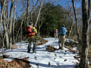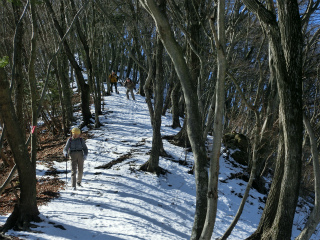 | 矢平山(大室山・上野原) 数年前の木曜山行で立野峠から東へ縦走して大地峠まで歩こうとしたことがあったが、寺下峠で時間切れで下ってしまった。私としては、そのときに桂川左岸稜線の一般的なコース、すなわち高畑山から高柄山までの朱線をつなげてしまおうというもくろみがあったのだが、結局寺下峠から矢平山を経て大地峠までが残ったのであった。 去年の暮れに倉岳山に登って立野峠から梁川駅に下ったとき、桂川を渡る橋から夕暮れの矢平山の姿がやけに立派に見えて、その場で今年早々の計画に入れよう思った。 しかし寺下峠から北へ下る径は歩いたわけだし、そちら側は車で出かけるには何かと都合が悪い。そこで南側秋山から登ることにした。そのほうが行程もかなり短くてすむし、南側で足元も安全だろうというわけだ。ほとんど山登りにはバスの便が使えないにひとしい地域だから車で行く意味もあろうというもの。 参加者は、前日は行きがけの駄賃で蜂城山に登った横山夫妻、そしておとみ山、一昔前では到底考えられない年齢の方々が元気に冬山を目指すわけである。 それにしても、車で雪道を走るのが嫌だからわざわざ暖かい方面へと出かけているというのに、都留から雛鶴峠を越える車道は八ヶ岳南麓よりずっと凍っていた。山も日蔭は真っ白である。 幸い南面の登路を選んだので稜線に出るまでは良かったのだが、寺下峠からは新雪の急登に少々苦しめられた。この冬はじめて、雪らしい雪を踏む山歩きとなった。 矢平山の手前のピークを丸ツヅク山というらしいのだが、そこから矢平山三角点にかけては、桂川左岸稜線の中でも白眉の美しさではないかと思われた。縦走の途中で通過するこになることが多い山だろうが、この山だけを目的にやってきて良かったと思った。 地形図ではわからない岩がちの急登を経て登り着いた矢平山の頂稜は東西に長い。三角点のあたりからは植林になりそうなので、その手前で昼休みとした。急登のあとだけになんとものんびりしたところである。 帰りは、甚ノ函山の南稜を下ったらどうだろうと色気も出たが、そこは安全第一で、林道をぶらぶら下ることにした。終始誰ひとりに会うこともなかったのは、東京近くの山だというのに不思議なことだが、やはり冬は山歩きをする人も激減するのだろう。 |