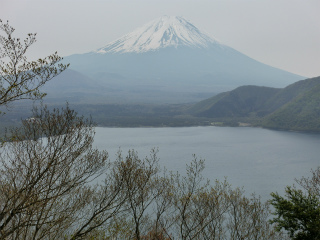 精進湖線を車が登っていく間の車窓からの新緑がすでに絶品である。トンネルで御坂山地を抜けると精進湖で、少々空は白かったが、富士は全容を現していた。