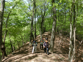 このあたりの山は地質のせいで、いたるところが絶壁になっているので取り付くのが難しい。しかしいったん尾根に上がれば、あとはごく平和な山歩きが楽しめる。芽吹きの遅いミズナラもすっかり芽吹いて、とにかく緑、緑、その間には鮮やかなヤマツツジが満開である。