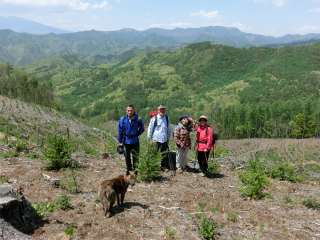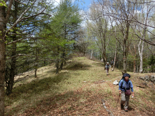 落葉松が多いとはいうものの、それはそれで緑は美しく、登るにつれて広葉樹も増えて、カエデ類の淡い緑がすばらしい。尾根筋を登るのだろうと予想していたのと道は違っていて、古い作業道に手を加えたらしく、山腹をうねうねと徐々に高度を上げていく。