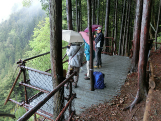 暗い植林地の中へ続く狭い歩道は恐ろしく急な斜面をトラバースして続く。譲り合いをしようと書かれた立て札がたくさんあるところを見ると、この道も観光客が多いときには渋滞するのかもしれない。展望地には制限40人と書かれた、金属製の足場板で組んだ展望台がしつらえてあった。