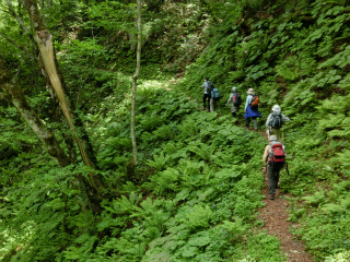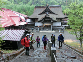 | 七面山(七面山) 10年ぶりの七面山であった。木曜山行もずい分長く続いているものである。 泊りでの山は天気がことのほか気になるが、当日が近づくにつれて天気予報が悪化してきた。初日は敬慎院まで、翌日に登頂して下山という予定だったが、2日目は朝から雨の予報となり、できれば初日のうちに登頂をしなければということになった。しかし羽衣からの標高差は1500m、これは近来にないハードコースである。ともあれ登ってみた具合で考えるしかない。 初日は予報よりは好天で、薄日が射していた。しかしそのせいでかなり暑い。山奥に感じられても、羽衣は標高500mしかないのである。一丁も登るうちには次々に薄着になることになった。 荘厳な雰囲気は登山道というよりは参拝路だからで、道の両側には杉の大木も多く、老若男女が歩けるようにと傾斜は歩きやすくつけられている。単調ではあってもそんな道のおかげでいつの間にやら高度を稼いでいる。植生が亜高山めいて、敬慎院の和光門を午後1時には通過した。これなら今日中に登頂ができるだろう。それにしてもこの山中に突然現れる伽藍には毎度のことながら驚かされる。 随身門を過ぎるとやっと普通の登山道らしい雰囲気となる。間近で見るとすごい迫力のナナイタガレも霧に隠されずに見ることができ、深山の趣の濃いシラビソの林を抜け、5時間かけて登頂した。 1000人泊ることがあるという敬慎院に泊ったのは我々以外には4人だけだった。そのたった11人で朝夕のお勤めに参加したが、読経の僧侶が10人近くもいるのだから、ほとんどマンツーマンである。現在本堂の奥の方で230年ぶりという改修工事中で、ご本尊七面大明神は普段よりずっと前の方に置かれている。そこで本来であれば遠くて見えないお顔をよく拝見することができた。10年前にもやはり朝夕の勤行をしたが、作法が変わったように感じられた。10年もたつとやり方が変わるのかもしれない。 勤行が終わり、長い布団に11人がずらりと並んで寝たのは8時。9時消灯とはいうもののやることもないので寝るしかない。例によって朝までは長いが、隣に気をつかう長布団ではなおさらで、起床4時はかえってありがたい。3時半にはもぞもぞと起き出した。 小雨は降っているらしいが院内のモニターには富士のシルエットが映っていたので遥拝所へ急ぐ。ご来光を拝むという天気でもなかったが、それでも前日にはまったく富士山など見られなかったのだから幸運のうちである。 朝の勤行を済まして朝食を終え、敬慎院を出たのはまだ6時過ぎ、もったいないようだが、これから雨が本格的になるだろうというのでは急いで下るしかない。幸い雨はさほど強まらず、木の下では傘の必要もないまま北口登山道を順調に下って、10時には角瀬に到着した。表口に較べると北口登山道は樹林の雰囲気がいいので楽しいが、しかし長い長い下山道である。 かつて日本経済新聞に七面山について書いたのでリンクを貼っておこう。http://yamatabi.info/7mensan.htm |