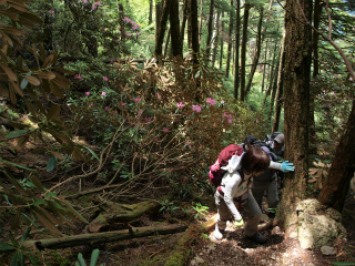| カンマンボロンから瑞牆山(瑞牆山) 瑞牆山のまわりは歩いているが、そのものにはとんとご無沙汰だったのは、人の多いことが年々嫌いになるからで、別に山の責任ではない。相変わらず瑞牆山はいい山である。 カンマンボロンからの瑞牆山のリクエストがあったので、瑞牆山荘からならもう結構だが、それならいいかと木曜山行の計画に入れた。ところが悪天順延でリクエストしたおとみ山は来られなくなった。 それでも順延などものともしない方々と金曜なら都合がつく人が四方から4人集まった。そのいずれもがお互いに初対面というのは珍しい話、しかしそこは同好者同士、5分も歩くうちには数年来の知己のようになった。 調べてみたらカンマンボロンのルートは8年ぶりで、それも晩秋だったからルートの見極めは比較的楽だった。しかし今回は緑の覆われた時季だから少々難しくなるかもしれないと思った。もっとも、この時季ならではのシャクナゲの森が楽しみなのである。 天気は順延しただけの甲斐のあった快晴に明けた。入梅して以来最高の天気だが、これも午後からは不安定になるという。 8年もたてば記憶もあいまいで、しかもこの季節は初めてとあって、こんな径だったかなあと少々疑いながら歩き出したが、踏跡が北を指すようになってからは記憶もよみがえってきた。 カンマンボロンのある洞ノ岩は葉の落ちた時季なら行く手に見えるので、それとわかっていれば簡単だが、クライマーの踏跡に惑わされて少々寄り道をした。カンマンボロンとは大日如来の意だといい、この岩壁に誰かによって彫られている文字がそれを表すというのだが、よくもこじつけたもので、どう見ても水の浸食である。 シャクナゲにはは少々遅いかと思われたが、標高を上げるにつれ見事になった。それにしても急登の連続で、そんな記憶が欠落しているのはやはりこちらも若かったからだろう。 一般道に合流してひと登りで頂上に着いた。珍しいことに2人がいるだけの静かな頂上だった。奥秩父の山々以外は雲の中だったが、それでも上出来の好天である。八ヶ岳南麓は雨が降っているらしく白く煙っており、それが東に来ればこのあたりも危ないと思いながら昼休みをしているうちにはには案の定雨滴が顔に当たり始めた。 長居したい頂上だが濡れるのも閉口だから下山にかかる。当初は富士見平小屋から出発点に戻るつもりだったのを、雨が南寄りに通ると予想して、不動沢を下ることにした。不動沢のシャクナゲも見たい。 それが功を奏したのか、降られることもなく下山した。途中のシャクナゲの森は少々花は散っていたが、それでも久しぶりの花の当たり年には違いなかったろう、場所によっては葉より花が多いのではないかという光景も見られた。 |