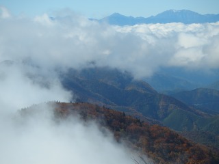 北アルプスこそ雲がかかってしまったが、それ以外、ことに中央アルプスから南側にかけて遠く三河の山まで見渡せる大展望であった。前日夕方に雨が降ったが、そのおかげか大気も澄み切っている。