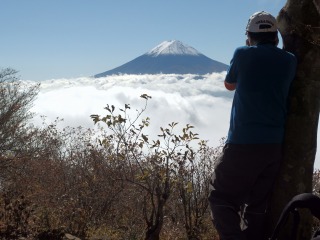 葉を落とした木々が多くなって森が明るくなったころ、御坂主稜のむこうに富士が見えた。どうも雲海に浮かんでいるようだ。