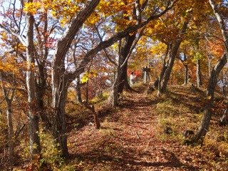 ブナやミズナラの多い、身体が黄褐色に染まりそうな山径である。前日までの雨はまだ乾いておらず径を覆った落ち葉はしっとりと湿っている。天気の回復が少々遅いらしく、霧が残って森を幻想的にもする。