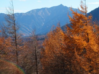 入野谷山を計画したのは、展望もさることながら、頂稜東側の樹林を秋にもう一度見たかったからだったが、前日に荒船山に登り、標高1400mくらいにもかかわらず、晩秋というよりはもう初冬の風情だったのを見て、1800mにも達する入野谷山ではさすがに秋は完全に終わっているかと思いきや、南北の緯度の差であろうか、広葉樹はほぼ落葉していたものの、落葉松は最後の絢爛を見せていた。