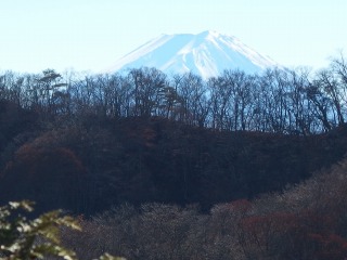 そこでカヤノキビラノ頭へ戻って、陽だまりで長い昼休みとした。落葉松の林越しに一段と白くなった富士が眺められた。