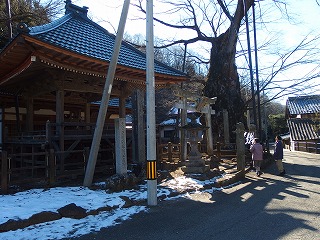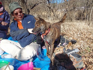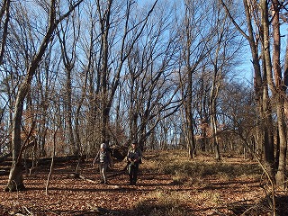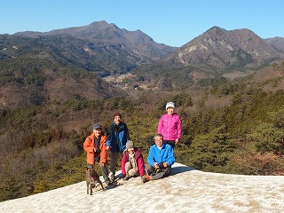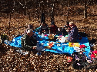 木曜山行新年会は年末から滞在中の3女史におとみ山が加わった。晴れて山々がすべて望めるのはいいのだが、寒風吹きすさぶといった天候である。あらかじめ予定していた座敷は感じがいい場所だが風が吹き抜けそうな尾根筋にあるので、一段下がった、かつては栗の畑だったらしい場所を宴会場に決めた。