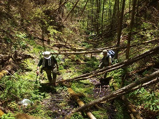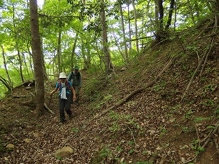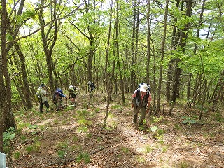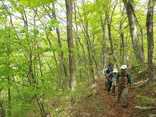 | 浅川峠〜扇山〜落合橋(上野原・大月) この4月初めの木曜山行で権現山から麻生山を経て長尾根を下ったとき、その長い下りが気に入った。しかし広葉樹がすばらしいにもかかわらずそのときにはまだ新緑には早かったので、では5月に計画していた扇山は、曽倉山に続く破線を登って浅川峠へ下るつもりだったのを、行程を長くして樹林をたっぷり楽しもうと、権現山同様、落合橋に車を置いてバスを利用することにした。要するにまた長い尾根下りで落合橋に戻ろうというわけである。 扇山はリクエストで選んだ山だったが、南側からの一般路で登るのでは芸がないというよりは面白くない。7年前の木曜山行ではその一般路で登っているのだが、登山口で写真を撮って以来、稜線に出るまで一枚の写真も撮っていないのは、登路に魅力が薄かったからだろう。 そこで北側から登ることにしたのだったが、やはり山は北側の樹林のほうが雰囲気がいい。すばらしい新緑だったのもさることながら、径の状態も上々だった。問題なのは登りついた扇山の頂上に魅力がないことで、ふたりが休んでいるだけで、昨日はそのふたり以外に行き会う登山者はいなかったが、踏み固められた土の上には前日までのゴールデンウイークの人いきれが残っているような感じがした。 まだ昼前だったし、長居は無用の頂上だからさっさと下ることにした。百蔵山へと続く長い下りは浅川峠から扇山の間の柔らかい径とは打って変わってまるで舗装路のように固かった。 落合橋へは地形図に破線があって、手持ちの1988年版昭文社の地図にも実線が入ってもいたので、それ以上下調べをしなかった。つまり道標完備の径だと思っていたのである。 このあたりで百蔵山への径と分岐するはずだという地点を数メートル行き過ぎて、オヤッと思って引き返した。暗い植林の中に薄い踏跡があって、どうもそこが分岐らしい。 一般ルートをたどるだけと思っていたからこれは意外で、最後、落合橋にたどり着くまで、いっぱしの気を遣う藪尾根だったのである。これでは昭文社の基準の実線ルートなどでは決してなく、破線ルートとしても上級のものであろう。四半世紀の間にすっかり廃れてしまったというのだろうか。 この手の藪径にはこちらは慣れているから驚かないが、尾根が広いので下りにとるのはかなり厄介かとも思う。尾根の末端に至って、これは確実だという径をとらえてもう安心だと思っていたら、最後の最後で、沢の高みに続いていたと思われる径はすっかり山抜けで消えていて、少々すったもんださせられた。 家に帰ってから調べると、この稜線はコタラ山西尾根と呼ばれていて、篤志家のみがたどる尾根らしい。参加者には、ちょっと長いが一般路を歩くだけだと言ってあったので、裏切られたと思ったことだろう。 |