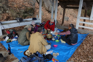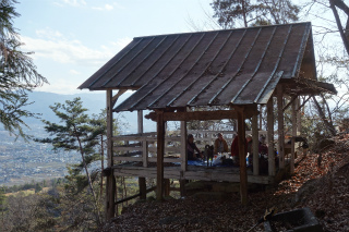 | 御前山(塩山) 今年は最初の木曜日が7日になって、ちょっと新年初詣登山としては遅くなってしまったが、すでに世間は新年気分が終わっているのに、こちらは山で新年を祝って酒を飲むというのも悪くはない。 ここ数年の新年山行は、ほとんど山は歩かずに済ますことが多かったので、今年は少しは歩くことにした。目標の山は棚山南東稜の776mピークで、名前がわからなかったので仮に妙見山としておいたが、家に帰ってから調べると御前山というらしい。山城があったという。 http://www.geocities.jp/sisin9monryu/yamanasi.yamanasi.html http://www.fukata-club.jp/mtomoide/2015/95/mtomoide95.html この山の中腹にある神社は妙見尊で、それが仮称の理由だったが、物見台のような建物が残っていて、盆地の眺めが恐ろしく良いのは去年の4月に行って確認してあった。富士山も見える。そこでここを参拝後にお借りして宴会をしようと思ったのである。 夕狩沢を登って背後から御前山に登頂した。大岩の累々とした頂上だったが、かつての遺構らしいものはなかった。その手前に、道が稜線を越えているように見える部分があったが、どうも堀切の跡だったらしい。 急な斜面を落葉を蹴散らしてなかば滑り落ちるように妙見尊にたどり着く。参拝後はお待ちかねの宴となり、それぞれが持ち寄った美酒美食が並べられた。 それにしてもこの建物は何に使われたものか、背後は岩の絶壁になっていて、古人はこういったところを神の坐すところとして尊んだのだろうが、その岩の上に社殿でもあって、今残っている建物は神楽殿的な意味合いがあったのかもしれない。天井や柱にはおびただしい落書きがあるが、昭和30年代以前のは見当たらず、さほど古い建物ではなさそうである。落書きを調べると、昭和40年代くらいまでは訪れる人も多かったらしい。建物の前の木々が伐採されたのはごく最近である。 下界を見下ろしながらの宴席が古来何度もここで開かれたことだろう。我々もその歴史に加わって3時間もの時を過ごし、おおいに気宇壮大になったのである。 |
