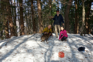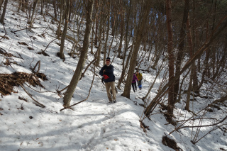 | 恩若峯(塩山) 先週に引き続いて雪のよる計画変更で、大沢山を恩若峯にした。大沢山は北向きの登降の標高差800mで、しかもこの積雪以来入山者があるとも思えないのでラッセルを伴うだろう。我々の力ではこれではちょっと無理だと踏んだのである。結果的にそれで良かったと思う。 恩若峯は過去2度とも勝沼から塩山へと歩いたから、今回は電車を利用して逆コースにしようと思っていたが、犬連れで行くことにしたので、それなら電車というわけにはいかない。自転車で車を回収する都合上、どうしても勝沼から歩くことなる。 恩若峯南西尾根は6年ぶりで(http://yamatabi.info/2010b.html#2010b4)、6年前にはまだ伐採したばかりの場所が何箇所もあって展望が楽しめる尾根だったのが、さすがに樹木が伸びていて少々眺めを隠し始めていた。それでも、この手の藪山にしては展望が楽しめる稜線歩きである。 雪の上には動物の足跡が入り乱れていたが、人の足跡はなかった。小なりとはいえど、いくつものコブを越えていく縦走で、意外に時間がかかって頂上に着いたのは1時を過ぎていた。頂上は暗くて面白味のないところなので、いったん下った陽だまりで昼休みとした。 去年の黒富士、信玄棒とご一緒したアメリカ人のWさんが昨日も一緒だったが、こんな山に登ったアメリカ人はひょっとして史上初ではないかという話になった。証明しようはないが、過去にあったとしてもわずかではあろう。 アメリカ文化の話、シベリア横断鉄道に乗ったときのロシア人の印象などなど、塩山の裏山ではなんとも場違いな話題で盛り上がったのち、藪径を一気に里へと下った。 |