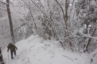 | 妙見山・差山(塩山・川浦) 旧牧丘町で造った鼓川温泉には、まだ八ヶ岳に移住してくる前にはよく行ったものである。その周辺の山に出かけることが多かったし、山中にある風呂の雰囲気も気に入っていたからだった。今からすると立ち寄り湯というものも少なかった。 3月の木曜山行で差山を思いついたとき、せっかくこの山に登るなら、帰りは鼓川温泉に浸かっていきたいと思った。なにせ登山口が温泉のすぐ脇にあるのだし、だいたいこの温泉が木曜定休なので、かれこれ15年以上も訪れることがなかったのである。だから今回、金曜日にずらしたのはただそれだけの理由だったのである。 残念ながら差山では名前に魅力がなかったのか、参加者はおとみ山だけで寂しい限りだったが、一日ずらしたことは功を奏して、遅ればせながら今年初めての新雪らしい新雪の山歩きを楽しめたのだった。 地形図の山名表記の妙見山が差山に変わったのはまだ最近のことで、以前の表記を見慣れていたからとまどったわけだったが、その妙見山ですら、小楢山の登り降りにわずかに頂上を通過するだけの山だったのだから、それが差山になって、さらに知名度は落ちたわけである。むろんこの山を単独で目指すなんてことは皆無に近いが、冬の日帰りの山登りとしてはこのくらいが我々の能力に応分だろうと考えたのであった。 大沢山から下ってくるならまだしも、鼓川温泉からは取り付きがやや難しく、昨日は雪のためにさらに難しくなっていた。まあ、それでも登りは何とかなる。差山までたどり着いたら、帰りは足跡が残っていて確実な往路を戻ろうかと最初は思っていたが、登るには大丈夫でも下るには雪があると大変なところが何箇所かあるので、それに気を遣うよりは、すぐ北側で稜線をまたいでいる林道まで下って、生捕への破線路を下るほうがいいと考えなおした。それにしても差山から北にはわずかながら鎖のかかった岩場があって、雪がなければどうということもないところだが、少々苦労させられることになった。 一次の峠とある林道出合から生捕に下るのは初めてだったが、これは地形図を見れば、傾斜のゆるい浅い沢筋を下って廃れた林道に出れば、それをたどればいいだけで、こちらは雪のおかげでむしろ楽に下れたのであった。 下山後そのまま温泉へドボンというのはやはり気持ちがいい。平日のわりには混んでいたのは、地元農家が雪で作業は休みで、温泉へと繰り出していたからだろう。駐車場には軽トラックが多かった。 |