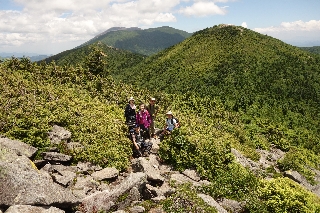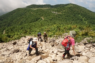 | 東西篭ノ登山(車坂峠) 木曜山行で浅間連山に出かけたのは2008年の湯ノ丸山が初めてで、目新しい山が近所に少なくなったので、それではと群馬県境まで遠征してみようと出かけることにしたのだったが、行ってみれば、たとえば山梨県内でも道志や山中湖の山に出かけるよりはずっと距離が近いことがわかって、なんだ、そんなことならこっちのほうが新鮮でいいやと、わりと足しげく行くようになったのである。以来8年たつが、めぼしい山にはほとんど登ってしまった。 水ノ塔山と東篭ノ登山を縦走したのは湯ノ丸山の次にこの山域に出かけたときで、それも6年前のことになる。そのとき西篭ノ登山は面倒になって登り残したので、昨日はそれを目的に計画を立てた。調べたら偶然にも前回と1日しか違わない日で、やはりこの季節、わが頭の中は納涼の二文字しかないと見える。車が2000mの高みまで運んでくれる山はそうたくさんはない。 池の平から篭ノ登山だけでは遠路出かけるにしては簡単すぎるかと、三方ヶ峰も含めて歩こうかと当初考えていたが、ここは納涼物見遊山でいいではないかと考えなおして、結果的にはそれでよかった。 毎年天気が悪いイメージしかない七夕の日だった。久しぶりに木曜が好天の予報でそのとおり夏らしい好天の朝になった。下界は厳しい暑さになるという。ならばなお良し、うだる下界を睥睨して、こちらは山上の風に吹かれようではないか。 池の平の駐車場はすでに半分以上車で埋まっており、バスを降りた団体も出発しようとしていた。しかしその9割以上が池ノ平湿原や三方ヶ峰へ出かける人たちで、篭ノ登山への登山道に入るとすぐ静かになった。 東西篭ノ登山も数えられるくらいの人しかいなかった。北アルプスまではすっきり見えないが、遠く富士山まで指摘できたのはこの季節としては上出来で、むろん近所の山はすべて見えた。心配したのは虫だったが、うまい具合の風が吹いていて、涼しいうえに虫まで吹き飛ばしてくれた。 すっかり納涼して下山し、まだ午後早いうちに千曲川の対岸で浅間連山を望む露天風呂に浸かった。帰り道、小諸の気温の電光掲示は36度、ここでこの気温なら他ではどうだったのだろうと家に帰ってニュースを見たら、勝沼が38.8度で日本一の暑さだったそうな。 |