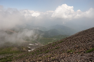 | 乗鞍岳(乗鞍岳) 木曜山行で乗鞍岳に登ったのは8年も前のことで、もうそんなにたったのかと驚かされる。そのときは乗鞍高原から畳平へ向かうバスが土砂崩れのために運休していることをバス停まで行って初めて知り、せっかくここまで来ていてもったいない、聞けば平湯からはバス便があるというので、安房トンネルを通って岐阜県から入山したのだった。 長野県側が通行できなければ入山者は半減どころではない。これが怪我の功名になって、ほとんど貸し切りのような状態で乗鞍岳に登ることができたのである。 昨日は、バスを使うにしても少しは変化を持たせようと、登りは肩の小屋入り口からとした。似たようなことを考えそうなものなのに、ほぼ満員の2台のバスからそのバス停で降りたのは我々と、スキーを担いだ人ひとりだけだった。夏スキーのメッカだとはいうが、今年の積雪はすでに例年の8月末くらいの量らしい。わずかに残った雪渓を滑っている人もあったが、これではさほど楽しめまい。 雪が少ないかわり、本来ならもう少し遅く咲くはずの高山の花が、肩の小屋までの登山道脇にはびっしりといっていいほど咲いていた。展望はほとんど楽しめなかった昨日だったが、花については満足できたのである。 肩の小屋からの登山道では、学校登山の中学生と出くわしたこともあって、すれ違った人は200人どころではなかっただろう。前回にしても、もしバスの運休がなければ似たようなものだったのだと思う。 展望がないので早々に下ったが、下る途中では雲が切れて展望も少し得られた。肩の小屋でおそい昼食としている間には雷が鳴り始め、これは来るかと急ぎ足で畳平へと向かう途中で激しいあられとなった。だが、畳平までは車道歩きなので助かる。 目まぐるしく変わる天気はさすが高山である。納涼どころか、すっかり身体を冷やしてしまったので、ふもとの温泉では珍しく長湯をした。 |