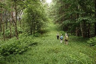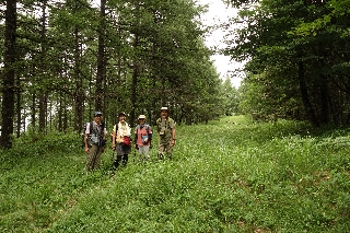 | 霧ヶ峰の防火線歩き(南大塩) 木曜山行前半最後は午後から納会を控えているので軽く高原歩きでもしようと行先は霧ヶ峰と決めていたが、霧ヶ峰といってもいささか広い。展望がある日なら多少にぎやかでも高いところを歩けばいいが、それがないならにぎやかな場所にわざわざ行くこともない。先日探ったばかりの防火線歩きでもしようと思っていた。 朝方の予報では午後から弱い雨が降るとのことで、それならと防火線歩きを選んだ。ぶらぶらと今や緑の盛りの径を行く。こんなところを選んで歩く人はいないから、終始誰に会うこともなかった。 午後になったら予報とは裏腹に晴れ間が広がるようになり、ロッジに帰ったら梅雨明けしたという。夕方からベランダでバーベキューをして納会の予定だったので、心配していたのは山よりはそちらの方だったが、いかにも梅雨明けを思わせる夏の空が暮れていくのを眺めながら、おおいに飲んで食って、今年前半の無事を祝うことができた。 |
