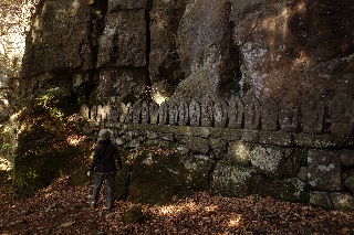 | 閼伽流山(御代田) 佐久に閼伽流山という山があることを教えてくれたのはMさんで、最初はどう読むのかもわからなかった。この「あかるさん」がどこにあって、どう登ればいいのかを調べ、出かけたのは2009年の5月だった。計画では違う山だったが、雨模様だというので、林道を歩くだけで済みそうなこの山に急きょ行先を変えてのことだった。 なるほど、これは天気が怪しいときに行くには最適の山だなあと気に入って、その月のうちにもう一度登ったしhttp://yamatabi.info/0904.html、そんな天気の日にばかり何度も登った。たわら写真集にその一例があるhttp://yamatabi.info/tawara-20091228.html。車の通らない林道を、古い墓石や観音像を見ながらぶらぶらと登っていく。頂上直下の垂直に切れ落ちた岩の伽藍の下には何十体もの石仏がおわす。ちょっと他にない雰囲気の山だし、広い休憩舎があるおかげで、雨宿りもできる。 「信濃閼伽流山」という立派な本があって、そのときの参加者のかなりの人が買ったが、まだまだ流通している。平山郁夫の絵が何葉もカラー図版で入っている豪華本だから、興味のある人は買って損はないと思う。ちなみにアマゾンでは高い。日本の古本屋のほうがずっと安く、1000円そこそこで買える本もある。 山の存在を教えてくれたMさんはあいにくこの山に登ったことはなく、前々から一度連れていけと言われてきた。そこで、山歩大介さんのリハビリにもちょうどよいとあって木曜山行の計画に久しぶりに入れた。ところがおふたりの都合がいい日が木曜日ではなかったので、11月の木曜山行を前後したり移動したりして昨日登ることにしたのだった。 その結果、閼伽流山に一度晴れた日に登ってみたいものだと思っていた私の希望も叶えられることになった。11月に訪れるのは初めてだったが、麓の明泉寺のもみじも見頃で、頂上近くの黄葉もすばらしかった。何より、仙人ヶ岳展望台から、今まで見たことのなかった展望が得られたのはうれしく、そこから槍穂の峰々が望めると知ったのも初めてだったのである。ものはついでと閼伽流山最高点まで行ってみた。そこまで登ると、もうほとんどの葉は落ちているが、落葉で埋まった林の風情もまた良かった。 数々の遺構の中でも、私がいつも見て感心するのは、芭蕉の句碑と呼ばれている自然石の下の石垣である。現地には何の説明もないが、これだけの石を積み上げて造った平坦地には何が建っていたのだろうか。登り下りが大変なほどの急斜面にこれだけのものを築く技術は現代人には想像しにくい。 |
