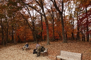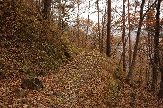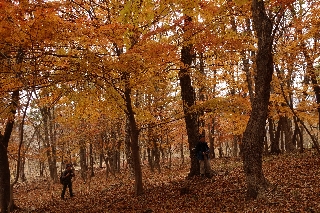 | 片山周回(甲府北部) この週は木曜日の予報が悪かったので、まず日曜日の横浜YYさんたちとの山行を片山にして紅葉の様子を確かめることにした。そして火曜日には横山夫妻との山行をまた片山にして、木曜の代替になるようにそのつもりでいた人を誘い、山歩大介さんが参加した。いずれもすばらしい好天で紅葉とともに展望も楽しんだのはこの掲示板で報告したとおり。 これにて木曜が雨天中止でもまあ仕方ない、見るべき紅葉はじっくり見たのでもういいやとなったわけだったが、直前になって天気予報が好転、雨は降らないだろうとなった。となるとおさまらないのは、そのつもりで木曜日を空けてあったおとみ山。自分だけ行っていないのは著しく不都合である。断固として片山に行きたい。それに、つい前々日に行ったばかりの山歩大介さんがまた付き合いましょうと言ってくれたのは、病後のリハビリに最適というのみならず、そのくらいの魅力がこの山にあるからであろう。 そこで今週はまるで片山に通勤しているようになってしまった。しかし毎度同じようなルートでも面白くないと、昨日は、まだ歩いたことのない、片山北側の歩道を調査してみることにしたのである。 住宅地に近い、山の南側の歩道でも滅多に人に出会うこともないとなれば、北側の歩道ではなおさらで、そのうえ冬を思わせる曇り空とあっては駐車場近くの遊び場で野外保育の園児を見た以外に、片山大宮山をぐるりと一周して、まったく人影を見なかった。 枝越しに市街地を見下ろす、明るい南側の歩道に比べ、北の山との間に帯那川の谷がある北側の歩道は意外なほど山深い感じがする。南側に較べると晩秋の風情の濃い歩道をたどって片山の紅葉の林へたどりつく。 まだまだ色の変化を楽しめそうな片山である。葉が散り切ってすぐの地面もさぞ美しいだろうから、これはちょっと見たい気がする。 |