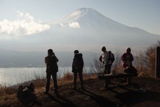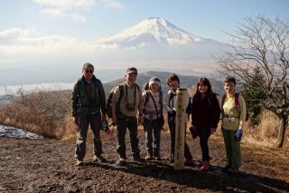 | 石割山(御正体山・富士吉田) 四季の変化のはっきりした日本の山では、気に入った山なら季節を変えて登ってこそ面白みも増すのだが、つい同じ季節を選んでしまうといった山もあって、私にとっては石割山がそのひとつである。木曜山行では2度、それ以前にも1度登って、いずれも冬枯れの季節だった。富士山の眺めが身上の山だから、富士がそれらしい雪のかぶり方をしている冬に歩きたくなるのだろう。稜線の落葉した木々を見るにつけ、新緑の頃も良かろうと思うのだが、そんな季節には他の山を選んでしまう。 木曜山行で前回登った様子はたわら写真集にあってhttp://yamatabi.info/tawara-20080117.html、しかしそれも10年近く前になり、そろそろ再訪をと計画したのはまたしても去年の冬のことだったが諸事情で流れた。そこでまた今年も計画に入れたのがやはり同じ時季になってしまった。どうも思考回路が固定しているらしい。 だがオーソドックスに石割神社からというのも芸がない、忍野村側から地形図にある破線をたどって西側から石割山に登ろうというが去年思いついた計画で、それはそのままとした。問題は下山方法だが、富士山の眺めが芳しくなければ二十曲峠へ、もし良ければ花の都公園に下ることにして、あらかじめ公園に自転車をデポしておくことにした。そしてほぼ完ぺきな晴れとなった。これならもう二十曲峠への下山など考えられない。登頂後は徐々に大きくなっていく富士山に向かってひたすらの稜線歩きである。 昭文社の地図によると忍野の貯水池からは実線が入っているが、入口にはまったく道標はなく、途中のまぎらわしい分岐にもまったく道標はなかった(稜線側からは道標があった)。もっとも我々は、より石割山に近い稜線に通じる破線をたどることにしていた。これはかつての植林作業道らしく、径形ははっきりしていたが草繁る時季なら歩くのは大変かもしれない。 石割山の南西直下に出て、頂上を往復する。頂上は火山土のぬかるみで、富士を眺めながら落ち着いて座る場所にも事欠くし、登山道も霜柱が融けだすとドロドロで歩きづらくなる。昼にはまだ早かったので、ひとしきり展望を楽しんだあとは早々に下山とした。 ちょうど平尾山で昼になり、富士の大景を前に長く休んだ。ここで3人、石割山で2人だけが昨日出逢ったハイカーだった。師走の山はすいているのがよい。 花の都公園へは4つの突起を越えていくが、その上下のことごとくが階段なのには閉口させられる。しかしこの地質では階段が土留めの役も果たしていることだろうとは思う。 花の都公園に近づくと、太陽が富士山の頂上あたりに落ちていくように見えた。はたして公園内では三脚を立てている人が何人もあって、どうやら昨日あたりが入日のダイヤモンド富士が忍野村で見られる日であったらしい。入日までもう20分なら自転車で車を取りに行く間にもその瞬間が訪れる。皆さんそれぞれ傑作をものにしたらしい。たわら写真集にあるとおり、先回も山中湖でダイヤモンド富士に偶然遭遇したのだったが、今回もまた遭遇するとは幸運であった。 最後の最後には紅富士の湯で、風呂屋のペンキ画ではない本物の富士山を間近に見ながら湯舟につかり、富士山漬けの一日を終えた。 |