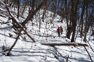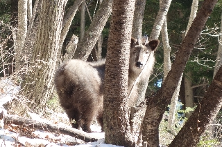 | 西向(若神子・韮崎) 先週、淵ヶ沢山に登ったとき、小武川を隔てて西向が見えた。荒倉山北の881.6m三角点峰である。もうそのときには数日後の雪の予報が出ていたから、もしある程度の降雪になれば、次の予定のトヤンハチは厳しいかもしれない、ならば久しぶりに西向に登ってもいいかなと考えた。この山に木曜山行で登ったのはちょうど6年前で記憶も薄れている、再訪するのもいいだろう。http://yamatabi.info/2012a.html#2012a4 予報通り、この冬初めての大雪となって、信州方面にスノーシューでもいいかなとちょっと考えたが、ロッジあたりでもマイナス10度を下回るとあっては、スノーシューを楽しめるような山まで行けば寒気が相当に厳しいだろう、そのうえ風でもあればまるで苦行である。「健康」登山としては無理は禁物だと、自分たちの住処よりは標高の低い西向で楽しむことにしたのであった。 東京では半世紀ぶりという寒い朝、もともと寒い我々の地域では異常な低温とまでは言えないが、それでも相当な寒さではある。しかしロッジより500mも低い、登山口の持久神社まで下れば、寒いとはいってもたかがしれていた。 前回、尾根に登るのに使った鉄塔巡視路は斜面の崩落で消え去っており、立ち木をたよりに強引に尾根に取り付いた。尾根に上がってしばらく登れば、今の地形図にもある破線のとおりに径は頂上へと続いている。 積雪はたいしたことはないが、地面が凍っているので、急な場所では少々てこずることになった。降る方法は多々あるが、安全を期して平川峠経由で大回りして帰ることにし、頂上から南へ少し下った林の中で昼休みにした。 平川峠、円池、宗泉院を経由して持久神社まではかなりの大回りで時間はかかるが、宗泉院まではのんきに歩ける。途中で2頭のカモシカを見た。カモシカも個体数が増えて、こんな街の裏山にまで生息するようになったのだろうか。 宗泉院の東には、以前にはなかった池記号が地形図にある。むろん池は以前からあって、池畔で5年前に新年会をしたことがあるhttp://yamatabi.info/2013a.html#2013a1。宗泉院からはこの池を通って破線が持久神社へと続いているが、葉の茂る時季に歩くのは難しいかもしれない。池のまわりの樹林がいいので、緑の時季に行ってみたいとは思うが、荒倉山ではヒル注意報が出ている、湿気の多そうなこのあたりは、おそらくヒルが生息しているのではないだろうか。 この山にしろ淵ヶ沢山にしろ、また、荒倉山から南に連なる山々にしろ、標高のわりには、津金の山あたりを歩いているのとは違った山深さと重厚さを感じる。それはすぐ後ろに控えている南アルプスのせいであろう。 |