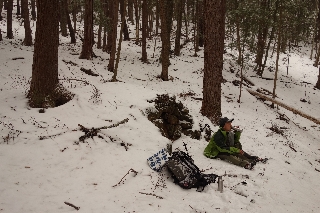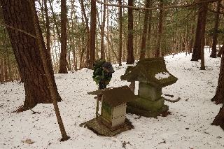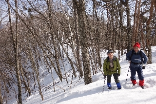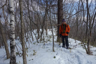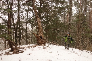 | 比志の塒(谷戸) 樹林の良い津金の山でも、笠無と比志の塒の頂稜の雰囲気の良さは出色で、それがこの山域に多く通う理由である。最後に比志の塒を歩いたのはいつだったかと調べたらすでに4年前で、そんなに間が空いたのかと思う。http://yamatabi.info/2014d.html#2014d3 津金の山はミツバツツジがすばらしいので、その時季を選ぶことが多いが、雪の季節には歩いたことがなかったので、地元の山にご執心のヤマネコさんのリクエストもあって、厳冬2月の計画に入れた。 しばらく行かないうちに、笠無の稜線がまたひとつ禿山になっていた。今のうちに登れば大展望が楽しめるだろう。その尾根を左手に見ながら沢を遡り、ケヤキの群生地から山腹のケモノ道を斜上して稜線に出るのが毎度の方法だが、雪の上に鹿の足跡こそたくさんあるものの、雪の下が凍っていて、尾根に取り付くのは簡単ではなかった。今年初めてアイゼンを履いて突破する。 津金山地の主稜線に出ると、枝を払った切り口がまだ新しかった。色鮮やかなピンクのテープが岩稜を通過する間には目障りなほど点々とある。目立つためにその色を選んでいるのだから設置者としては好意なのだろうが、あらずもがなの目印である。要するに、こういった山域に好んで入る人がこんなテープをあてにして歩くだろうかということだ。 主稜線に出ても人の足跡はひとつもなかった。積雪以来入山者はいなかったようだ。風は強かったが南からで、あたっていてもさほど寒くない。比志の塒の長い頂稜の適当なところで、風を避けるよりは陽光を選んで昼休みとした。 どこかをてっぺんとしなければならないような山でもないが、初めての人もあるので、昼食後、三角点まで往復した。以前はあった趣味の悪い山名板も朽ちてしまったのか見当たらなかったのは幸いだった。こんなところには何もないのが望ましい。長く持つようにと凝った山名板を設置する人があるがもってのほかの愚行である。 地面が凍っているので下りもアイゼンを履いたままだったが、有効だったのは雪がないところだけで、雪のあるところでは腐った雪が団子になってアイゼンなどないほうがいいという、妙なことになってしまった。 |