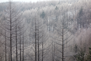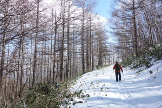 | 八千穂高原スノーシュー(松原湖) 去年の初夏、にゅうに登った帰りがけに立ち寄った「八峰の湯」がちょうど開館10周年とかで、無料入浴券をもらった。その有効期限が今年度一杯だったのだが、わりと出かける方角だからそれまでには使うだろうと思っていたのがあとひと月になってしまった。そこで、行先を八千穂高原方面としたのである。ケチ根性で山を選んだので、何か深遠な理由があったわけではありません。 雪遊びとなれば背景には真っ青な空が欲しいところ。しかし朝方は曇り空でどうも望み薄という感じだった。ところが現地に近づくにつれてどんどん空は青くなり、快晴といってもいいくらいになった。八千穂高原へと登っていくと、カラマツ林の霧氷が美しく、おとみ山と二人きりだというのが何とももったいない。 八千穂レイクあたりでスノーシュー遊びをしたとはよく聞くから、あのあたりまで行けば何とか遊べるくらいの雪はあるだろうという算段だったが、果たしてまずまずの積雪だった。しかし、東洋一という白樺林に通じる散歩道をスノーシューでペタペタするだけではやはり皆と同じで面白くない。そこで、八千穂高原よりは八ヶ岳寄りの八柱山の山麓あたりをうろついてみることにしたのだった。いくらスノーシュー遊びでも山登りには目的地がないとつまらないから、八柱山東稜にある1736.1mの三角点(点名・水無)をそれとした。 途中まではスノーシューは不要だったが、標高を上げるといよいよ出番となった。動物の足跡しかない雪に人間の足跡をつけていった。目的地の三角点は雪の下で見つけられなかったが、まずその場所で間違いはないだろう。 下りではスノーシューが威力を発揮する。雪がなければ入らないような急斜面をぐいぐい下っていくと、伐採地に出て、そこからの眺めがまた素晴らしかった。 |