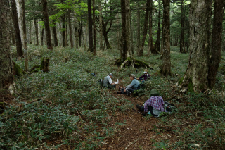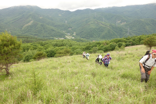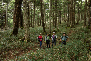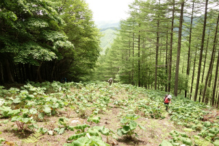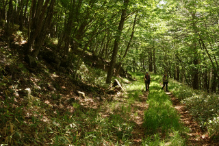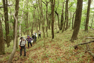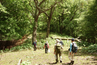 | 男女倉から小日向山(霧ヶ峰) ほとんどひとつだけ残った未踏のルートがあるがために、小日向山を「俺の庭みたいなものである」と豪語するにははばかれるところがあった。すなわちその、男女倉からのルートをたどって登ってみたいという個人的興味が昨日の木曜山行の計画になった。 当初、参加予定者が女性ふたりだけだったので、人跡まれな山を静かに歩きましょうと思っていたが(実情はふたりだけでも静かではないが)、小雨だとしても径のない山は下半身がぐっしょりと濡れてしまう。数日前の天気予報を見てどこか別の山にしようかと考えていたら、直前になって予報が好転、それとともに参加者も増え、木曜山行初の両手に花山行になるはずが、毎度同じく、静かな山のにぎやかなパーティになったのであった。 想像していたとおり、枝を払うこともない快適な稜線で、丈の低い笹原にケモノ道がうっすらと続いていた。これは小日向山を東西に結んで歩くときの最高のルートだと確信した。そして山の演出上、すべからく男女倉から登って星糞峠に降るべきだと思った。美しいミズナラの林から、あのさえぎるもののない大草原に出ていく爽快さ、そして八ヶ岳に向かって展望をほしいままに降る心地よさ。 計画の惹句に「ワラビの大収穫」と書いていたが、今年は花も山菜も10日近くも早いこと、しかもこれまでに2度、この山に大勢で入ってワラビの収穫をしていることから、さすがにもうあまり採れないかもと思っていたが、そこはさすがに小日向山、特級のワラビで各々リュックを重くして帰った。 |