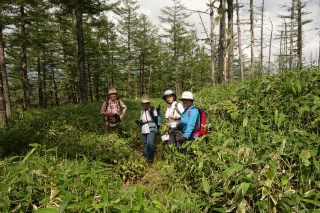 | 高座岩から2006m峰(信濃富士見) 曇りの予報に楽観的に思っていたが、夜が明けても屋根を打つ雨音がやまず、さてこれはどうしたものかと考えていたら家を出るころようやく上がった。それにしても、ゴンドラ代を払ってまで入笠山に行っても五里霧中では面白くないなと代案を考えつつ車を走らせていたら、行く手にすっきりと入笠連山が姿を現したので初志貫徹とした。 予報が悪いせいだろう、広大な駐車場は閑散としており、ゴンドラ駅にも他の人影はなかった。山上の駅前の植物園ではアツモリソウが咲いていた。今までこの時季に来たことがなかったのか、ここで花を見るのは初めてである。 傘をさすほどでもない雨がぱらぱらしたが、それもわずかな間で、稜線を越えて伊那市側に入ると空が明るくなった。2000m近くにいるというのに蒸し暑い日だったが風が強くて助かる。快適な稜線を歩いて高座岩でちょうど昼となった。 高座岩からいったん下り、テイ沢をさかのぼって大阿原湿原に出、その後入笠山に登るつもりだったが、夜中けっこうな雨量があったので、沢沿いの径が少々心配された。さらに、目の前に見える2006m峰にあらたな伐採作業道が拓かれているのを見て、入笠山に登ったことがない人がいるわけでもないし、ここにいる全員はもちろん、まずほとんど登った人がなさそうなこの山に登ったほうが面白いのではないか提案した。 入笠連山には2000m内外の似たような円頂を持つ山が多くあるが、地形図に名前があるのは入笠山以外には程久保山と釜無山だけで、あとはほぼ無名である。しかも登る人が多いのは入笠山のみである。これらのほとんどは登ったが、この2006m峰は未踏のひとつで、いつか機会があったらと思っていたのである。伐採後でまだ作業道がはっきりしている今は絶好のチャンスである。 作業道の入り口は難なく見つかり、それをたどるうちは楽だった。しかし、その後はハードな笹薮漕ぎをする羽目にもなった。頂上手前50mくらいのところまで通じていたかぼそい作業道がついに笹薮に埋もれたところで嫌になり、四捨五入で登頂とした。 釜無林道までまったく径がないようなら来た方面へ戻るしかない深い笹原である。幸い目指す方向に作業道の名残が続いていた。二手に分かれたその道をなるたけ行く先に近い方角へと踏み込んだら途中で途切れてしまった。いったん戻って、よりしっかりした道をたどったら、遠回りではあったものの無事釜無林道に通じていた。 やれやれ、あとはいささか長い舗装路歩きだがもう安心と思った。ところが、日ごろ交通機関の時間にしばられていないせいで、ゴンドラに最終があるのをすっかり忘れていた。最終は4時30分である。それに気づいたところで、普通に歩いていてはとても間に合わない場所にまだいた。それから急いだのなんの、入笠湿原からは私がひとりダッシュして駅に着いたのは4時29分、後続があるのでもう少し待ってくれと頼みこんで、なんとか事なきを得た。 気楽なはずの入笠山周回が、いつになくハードな山行になってしまった。 |
