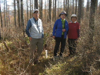 道のない尾根に入ると倒木がおびただしかった。それを乗り越え乗り越え、最後は少々急な斜面をズルズルと下ると目指す白砂青松の場所に出た。近くの白山、淡雪山といった感じのところだが、それらと違って訪れる人はほとんどいないようだ。人の足跡はいっさいなく、鹿の足跡が多くあった。ちょうど昼時となって、甲斐駒や羅漢寺山塊の展望を楽しみながら休んだ。