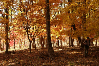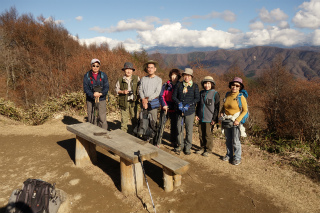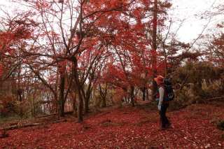 山の北側から片山の西端に回り込むと陽が射しこんで一気に明るくなる。その陽が入った西の平のモミジはやはりすばらしかった。参加のSさんが、京都くんだりまで出かけなくとも、ここで紅葉は充分に楽しめますね、と言ったが、人がいないだけでも京都よりいいし、古寺はなくともここからは富士や南アルプスの展望がある。こんな贅沢はないが、あまり喧伝するのはやめておこう。 |