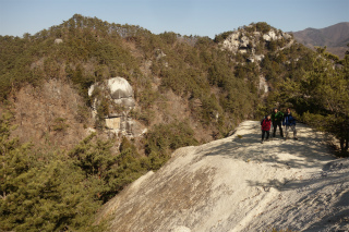 | 獅子平〜白砂山(甲府北部) 吉沢から金桜神社にいたる尾根道は御嶽外道と称し、荒川に沿う新道開削(現在の昇仙峡探勝路)以前は金桜神社への第一の参道であった。その参道も廃道に近い部分もあって、しかし別に並行して自然歩道が拓かれているので、ことに長潭橋から金桜神社まではすばらしいハイキングコースとなっている。そこで私が担当しているガイドブックが新版になったときに新たに羅漢寺山塊としてコース案内を加えたのだった。 それだけの歴史がある径筋に石造物がほとんどないのは不思議なことで、おそらく廃仏毀釈の時代にでもことごとく片付けられてしまったのではないかと想像している。2年前に歩いたとき、一緒だったすがぬまさんが、足元にころがっていた岩が石像の首なのに気づいたのは大発見といってもいいと思う。私が、目につきやすいように大岩の上に設置してきたので、ここを歩くハイカーは外道ノ原の上部で見ることができるが、このような石造物がかつてはもっとあったに違いないのである。 たとえ錦秋の時季でもパノラマ台付近の雑踏さえ我慢すればあとは静かに歩けるのが羅漢寺山塊のいいところで、しかしそれでもわざわざ人の多いところには近づきたくないと、旧道をたどって白砂山をゴールにすることが多い。 さて、昨日は猪狩山の予定だったが、この山は猪狩集落の裏山だというので私が名付けた山で、本当の名前はわからない。かつて麓で尋ねたことがあるが住人も知らなかった。猪年だというので苦し紛れに計画に入れただけで、かつては頂上が伐採されて展望が良かったから登る価値もあったが、今では檜が育ってそれもはかばかしくない。 そこで白砂山の一段下にあるテラスを探ってみようと出かけた。信玄棒テラスから見ると、なかなかそこも素敵なテラスに見える。もとより一般道があるわけではない。白砂山の頂稜から、まず私が活路を見出そうと下って行ったが、ひとりならまだしも人づれで行く傾斜でもなく、花崗岩の根元を縫って下れば行けなくもなさそうだったが、登り返しが相当な苦労だろうと潔くあきらめて白砂山で終わりとした。 台風のよる倒木はこの山でもひどく、ことに旧道では行く手をしばしば邪魔されたが、終始誰にも逢わないまま、静けさに満ちた陽だまり山行を終えた。 |