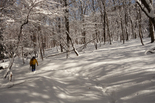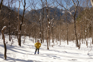 | 大平(長坂上条) 藪の湯の南西側の裏山に広大な平坦地があるのを地形図に見つけて、どんなところだろうと行ってみたのはもう13年前のことである。地形図ですぐ東側にある甲斐駒カントリークラブと較べてみればよい。木を伐採し芝をはればそのままゴルフ場になりそうな広さと傾斜である。この地を大平というのを知ったのはその後のことだが、何で知ったのかをすっかり忘れてしまった。ちなみに藪の湯へ行くときに渡る大武川にかかる橋は大平橋という。 たどり着いた平坦地には屋根の落ちた建物があって、かつての作業員用宿舎、要するに飯場の跡かと思われた。あたりにはおびただしい数の一升瓶がころがっていた。こんなところに寝泊まりしての作業では唯一の楽しみだったのだろう。 こんな建物があったのなら麓からの道があるに違いないと探ったら果たしてあって、これなら誰でも登れると、その翌年5月に緑陰の宴というのをここで催した。10人以上が集まって、山の上まで酒や料理を背負いあげて大宴会をしたのだから皆さん元気だった。 -------------------------------------------------------- 金曜日に順延した木曜山行はおとみ山しか参加希望者はなかったが、それもそのはずこの冬初めての積雪になるというので、なかなかそんな気なれなかったのだろう。そこで、おとみ山の好きな尾白の湯で雪見風呂としゃれこもう、しかしそれだけでは山行にはならないから、行きがけの駄賃に立ち寄っていこうと思いついたのが大平だった。12年前の大宴会にもおとみ山は参加していたのだが例によって忘却の彼方らしい。 ロッジ山旅のあたりで積雪20センチというところか、家のまわりの雪かきを小1時間してからの遅い出発だった。降雪直後の晴天で現地へ向かう車窓からの光景はすこぶる見事である。 12年ぶりともなれば記憶などほとんどなく、これだったかなと思って入った道は、間伐用に拡幅され、しばしば分岐が現れ迷路のようになっていた。雪のせいでさらにわかりにくい。 途中で少々迷ったものの、山勘を最大に発揮して、なんとか古い径を発見、無事大平にたどり着いた。西に向かっての広大なゆるい傾斜地はなにせゴルフ場並で、それが新雪で埋もれているとあっては、ちょっとこんな低い山中では見られない風景である。 またここで宴会でもしたいものだという話になったが、さて実現できるかどうか。 大平付近では30センチくらいはあった雪で登りには少々苦労させられたが、帰りはそのおかげで足任せにぐんぐんと下ることができた。下山後に行った尾白の湯、寒いから露天風呂はほぼ貸切のようなものだった。ドボンと浸かったら、さすがに身体が冷えていたらしく、湯がジンと染みた。 |