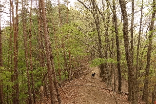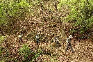 | 鳥井峠東稜線(若神子・谷戸・瑞牆山・茅ヶ岳) 足和田山から三湖台への稜線は、傾斜のゆるい下りが続く、実にのんびりと歩けるハイキングコースだが、どういうわけか冬にばかり出かけていて、想像するだに新緑は美しかろうなあという樹林の様子を知っていながらその時季には出かけたことがなかった。 そこで連休後でいささか疲労がたまっているときには最適かと思って計画を立てたが、いかんせん富士五湖地方まで遠征するほどには人が集まらなかった。まあ、それならそれで地元で選択肢はいくつもある。ちょうどロッジ山旅あたりの新緑がきれいなので、標高1000m内外の山を物色して、鳥井峠東稜線を思いついた。 これは7年前の紅葉の時季に木曜山行で出かけてhttp://yamatabi.info/2012j.html#2012j2、その紅葉が良かったのだから新緑もきれいに決まっている。新味を出すために前回とは下り方を変えてみることにして出発した。 この稜線にはかつての江草村と増富村の村界があって、当然そこには径があったわけで、今でもその痕跡がいくつも見られる。昨日は歩き始めてすぐ、足元に寛永通宝が落ちていた。滅多に人が歩くこともないのにまったくヤブを分けるような部分がないのは、このあたりの山の美点だが、それにしてもここは特別で、道標さえ設置されたら立派なハイキングコースになってしまうくらいの歩きやすい尾根である。テープの類がまったく見当たらないのも好ましい。これを読んで行ってみようという人も、万が一にもつまらぬ親切心を起こさぬようにしてほしい。 あくまで柔らかい地面を踏んでのんびりと新緑の中を登っていった。ところどころでヤマツツジが満開になっていた。今日はここから下ってみようという場所に目印を置いて、栗屋峠の三角点まで往復することにした。その三角点峰の手前の突起を登っていると行く手の空がやけに明るい。登り着くとそこから先は大伐採されて、丸山から横尾山、瑞牆金峰までがずらりと並んでいた。もうほとんどの作業は終わっているようだが重機が一台動いていた。いずれ植林されるのだろうが、それらが育つまでは景色が楽しめるだろう。もっとも、ここまでやってくる人は滅多にはいまいが。予期していなかった展望を楽しむことにして早めの昼休みとした。 作業中の横を歩くのも気が引けて、栗屋峠の三角点に行くのはやめ、いったん戻って下りだしたが、複雑な地形で方向を見誤って思った地点に降りられなかったのはちょっと残念。しかしそのおかげで途中で山菜をたっぷりと収穫できたのはケガの功名というものだった。 いつもは車で通過するだけの比志の集落を歩いて車に戻った。歩くといろいろのものが見える。ついでにこれも案内板を見ているだけだった比志神社にも参って、天然記念物の大杉も見物した。 |