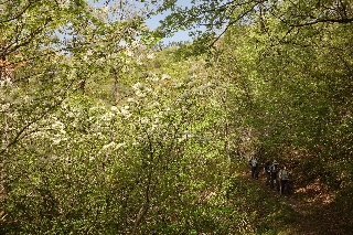 | 白山~甲府の北山を歩く(甲府北部) 富士五湖地方に住んでいたころ、いち早く新緑を楽しもうと4月には甲府の北山を訪れることが多かった。同じく春の遅い八ヶ岳南麓に住むようになってからも思いは同じで、木曜山行でも何度も歩いた。 甲府の北山は麓から広葉樹の雑木林に覆われているのが何よりの美点で、そこに武田の杜の歩道が整備されているのだから贅沢である。東は愛宕山あたりから西の片山まで、歩くコースには事欠かない。甲府の街は同じく山都の松本と較べると残念ながら歩く魅力には欠けるが、松本には甲府北山の歩道のような気の利いた山道はない。甲府市民は誇るべきであろう。 今年は甲府が開府500年の節目だという。そもそもの甲府の発端は、武田信虎が、盆地を睥睨する高み、躑躅ヶ崎に、背後の北山を天然の要害として館を移したことによる。その当時の人が見ていたのと少なくとも山の形が変わらないことを思うと、ここを歩く興趣も深まろうというものだ。 数日前までは雨マークがついていた予報が昼間は晴れると変わった。その代わり甲府では30度にも気温が上がるという。たった5日前に片山へ向かう際に車窓から見た山は新緑に山桜が混じった淡い色彩だったのが、すでに山桜は散って緑はやや濃くなっていた。 白山の白イワカガミを見に行こうというのが計画の主眼だったが、それだけなら歩くには短すぎるというわけで、鳥獣センターを基点に武田の杜の歩道に寄り道する周回コースを設定した。 道端には小さな花々がたくさん咲いていて、そのたびに立ち止まっては観察するので歩みは遅々として進まなかった。折しもイチリンソウの群落が盛りだった。山桜は散っていたが、代わってアオダモの白い花穂が至るところでたわわだった。 中峠で昼の休憩をしたのち、がぜんヤブになった稜線を登るとそのあたりから白イワカガミが現れだした。倒木が多く、一般コースとは言い難い。 和田峠の車道を横切って白山の一角に入ると、そこここに白イワカガミがあって、しかしちょっと盛りを過ぎて落花しているのが多かった。同じ山塊だというのに、八王子山から湯村山への稜線に入ると、あれだけどこにでもあったこの花がまったくなくなってしまうのだから不思議である。 眺めのよい露岩の上に立つと、太宰治がシルクハットの底と形容した甲府盆地の向こうに午前中には雲の中だった富士山が現れていた。30度になると脅されていたが、それほどの気温にはならなかったらしい。ほどよい汗をかいて出発点に戻った。 |