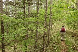 | 大室山~野尻高原(鳴沢) 一昨年の秋の木曜山行で、長尾山とその付近の富士山の側火山を探ってみようと出かけたが、長尾山だけ登って、大室山に行先を変えてしまった。https://yamatabi.info/2017i.html#2017i1 その行程がとてもよかったので、やはり大室山は新緑に限ると、去年はそれまで大室山の北半分しか歩いていなかったのを南側も探ってみようと出かけ、またまた新たな魅力を発見したのだった。https://yamatabi.info/2018e.html#2018e3 今年の計画を考えているとき、ロッジのご常連、富士宮のFさんが大室山に行きたいと言っていたのを思い出した。3年連続ではとも思ったがその気になったのは、長尾山の西麓に大草原があるのを航空写真を眺めていて気付いたからだった。 調べて見たら野尻草原というれっきとした名前があって、私が寡聞にして知らなかっただけのことだったのである。もっとも、人の出入りが多いところではもちろんないらしい。そこで、この草原歩きを組み合わせたらさらに楽しいコースになるだろうと思って今年も計画に入れたのだった。そしてその通り、実に変化に富んだ楽しいルートだった。もっとも、最初と最後には勘違いをやらかしていささか時間を食ったが・・・。 勝手知ったる精進口登山道に入ると、おびただしい倒木が道のわきに片付けられていた。空がやけに広い。去年の台風の被害らしいが、まるで恐竜でも歩いたあとのように道の両側の木々がなぎ倒されていた。風の通り道にあたったのだろうか。しかしそれもあたりが溶岩の上に育ったうっそうとした樹海になるまでだった。密集した樹林帯には風が入らないのだろう。 ひとつ先の分岐で曲がるつもりだったのを間違えて手前で曲がってしまったのがまず最初の勘違いだった。ままよと道なき樹海を横断することにしたが、これは怪我の功名というやつで、さまようがごとく樹海を歩くことはなかなかできない。天気でも悪かったら気味の悪い樹海も、空が明るいので楽しく歩くことができる。 大室山の斜面に突き当たると地面と樹林が画然と変わるのがこの山歩きの面白いところである。あとは何度味わっても飽きることのない美しい新緑の樹林をひたすら味わった。 この上なく美しい奥座敷でたっぷりと昼休みをしたあとは、方向を定めて下り、しかしこれもあとで考えたらもう少しルートの取り用があったとも思うが、まあ、それでも野尻草原にたどり着いた。山の上では半分以上雲に隠れていた富士山はほぼ全容を見せていた。暗い樹海の真横に明るい草原があるのが何とも面白い。なんだか童話で読んだようなシチュエーションである。草原に住む家族の親が子供に、「あの森に入ってはいけないよ」。 富士山が視界になければまるで霧ヶ峰でも歩いているような草原だった。これはいいなあと感嘆しきりである。ところどころでズミの咲く高原を歩いて、あとは出発点に戻るだけだったのが、最後の最後で方向を見誤った。そのおかげで1時間近くをロスしてしまったのは申し訳なかった。久しぶりに狐に鼻をつままれたような気分がしたが、なるほど答合わせをしてみたら間違いがはっきりとわかった。要するに縦横無尽に通じる作業道と車道に惑わされたのだった。それはそれ、これはぜひともまた出かけたいコースである。 |