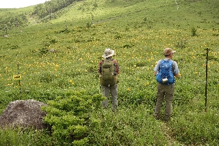 帰りは車山~蝶々深山のメインコースをはずれて、尾根伝いに歩くつもりだったが、尾根の南側が見えるところまで来ると、草原がニッコウキスゲで黄色く染まっているのが見えた。人出の多い場所では鹿柵を設けてキスゲを保護しているわけである。たとえ柵の中でも、ここまで来て花を間近に見ないのも意固地な話なので、コースを少し変更した。しかしメインストリートへと出たとたんに列をなしてやってくるハイキング客と次々にすれ違うことになった。