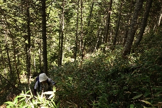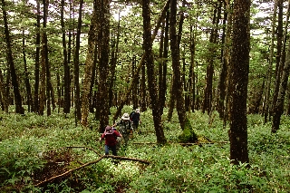 同じ苔の森でも、白駒池あたりとは印象が異なる。白駒池あたりは暗く、こちらは明るい。昭和40年初頭のガイドブックを読むと、渋の湯から黒百合平へ行く途中の稜線が「無残にも皆伐されて」と書かれている。その後育ったのが今の林で、おそらく白駒池あたりに較べるとずっと若い林なのだと思う。