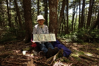一汗かいてたどり着いた、目的地としていた小ピークは、ほぼ針葉樹の森ではあるが、さほど密生もしておらず適度に明るい。乾いた苔の座布団もふんだんにある。真夏の休み場としてはこのうえない雰囲気だった。夕方になれば妖精も現れるだろう。