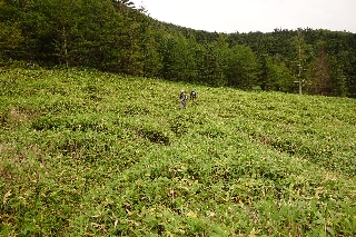 天祥寺平から亀甲池に向かう途中、突如としてこの夕日ヶ丘の斜面を覆っていた笹が途切れて、柔らかい草の斜面となる。どこからでも上へ登っていけそうだ。おそらくかつては全山こんな草山だったのではないだろうか。