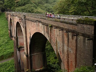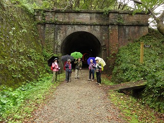 | 碓氷峠廃線路歩き(軽井沢) 4月の初め、骨折後のリハビリ歩きには最適かと篠ノ井線の廃線路歩きをした(参照)。それがなかなか良くて、次は、鉄道廃線路歩きのマニアならずとも知っている、碓氷峠の旧信越線の廃線路をいつかは歩いてみたいと思った。 今週はあいにく木曜日だけが天気が悪い。さらにあいにくなことに、関西や名古屋から4人が山行に参加することになっていた。大雨でまるでダメというわけでもなさそうだが、しかし日帰りの山で雨はごめんこうむりたい。そこで廃線路歩きならと思いついた。整備された道なら少々の雨でも問題ないし、篠ノ井線のときの参加者が3人いるのも好都合である。 木曜山行では浅間山から西へは行ったことがあるが東は初めてであった。バイパスができてからは国道18号の旧道を通る車は少ないのだろう、軽井沢駅を過ぎるとほとんど行き交う車はなくなった。軽井沢側からはゆるくわずかに登ると碓氷峠で、峠を越えると、こんなに下るのかと驚くぐらい一気に下る。要するに、横川から登ってきたら、軽井沢一帯はとてつもなく広い山上台地になっていることになる。 さて、横川駅から歩き出した廃線路は「アプトの道」と名付けられ、紅葉には早い平日の昨日はほとんど人もいなかったが、山が紅葉し、道脇に延々と植えられたカエデが色づくころには相当な人出があるのではないだろうか。 バラストがそのままで歩きづらかった篠ノ井線と異なり、バラストはアスファルトで固めれていたし、トンネル内は舗装され、その他の部分も細かい砕石が敷き詰められていた。つまり土を踏む場面はほとんどなく、雨でも足元に気を遣わずに歩ける。篠ノ井線の廃線路とは金のかかり方がまるで違う。 午後から晴れるとの予報も、休憩所で昼休みをする頃には雨が降ってきて、午後の部は傘をさしての出発となった。しかし途中のあずまやで休憩しているうちにはやんで、空は明るくなった。 この廃線路歩きは後半(昭和38年以前の鉄路を歩く部分)が圧巻である。数々の総レンガ造りのトンネルや橋が現れ、まったく明治時代の労働力というのはすごかったのだなと感嘆させられた。紅葉の盛りに歩いたらさぞ山の色が見事だろうが、「廃れ物」を見るには人影が少ないに限る。 |